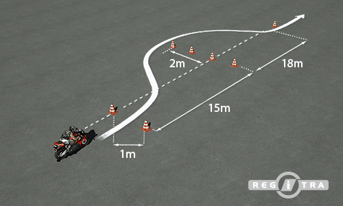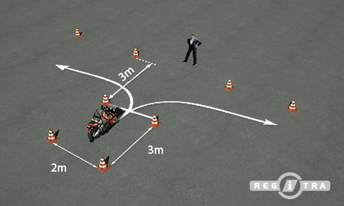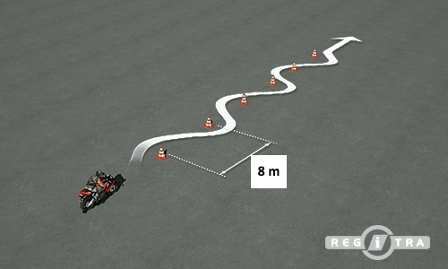 Šiam pratimui atlikti reikalingas įgūdis su motociklu padaryti vingį didesniu greičiu. Mūsų nuomone šis pratimas yra vienas pavojingesnių iš visų A kat. pratimų aikštelėje.